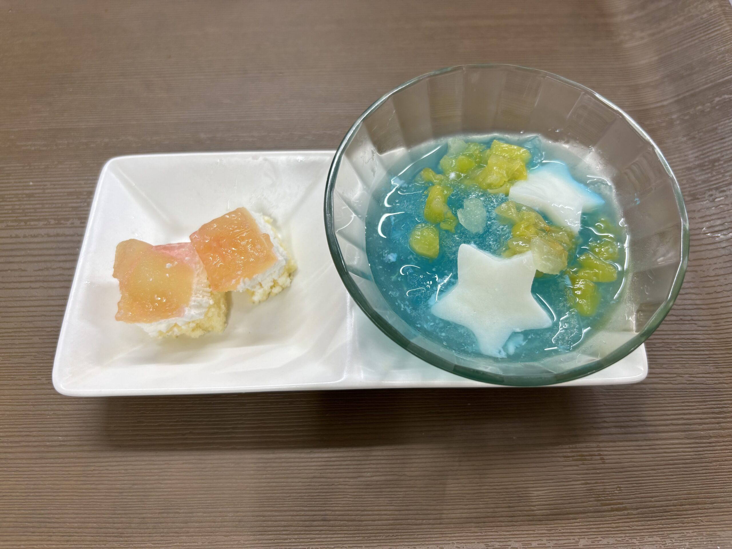 北海道では8月が七夕ということもあって、厨房さん特製の七夕ゼリーとケーキをご提供しました。